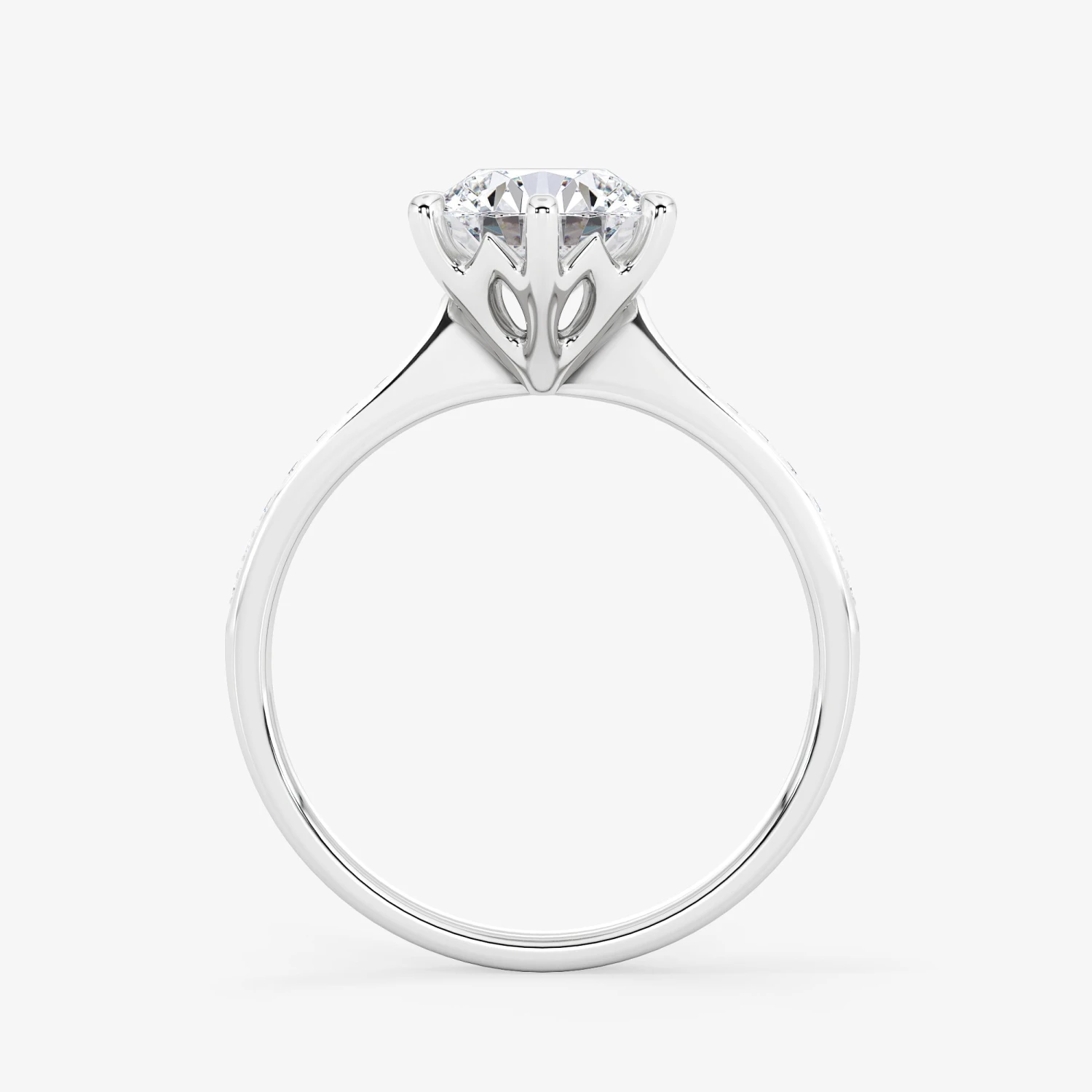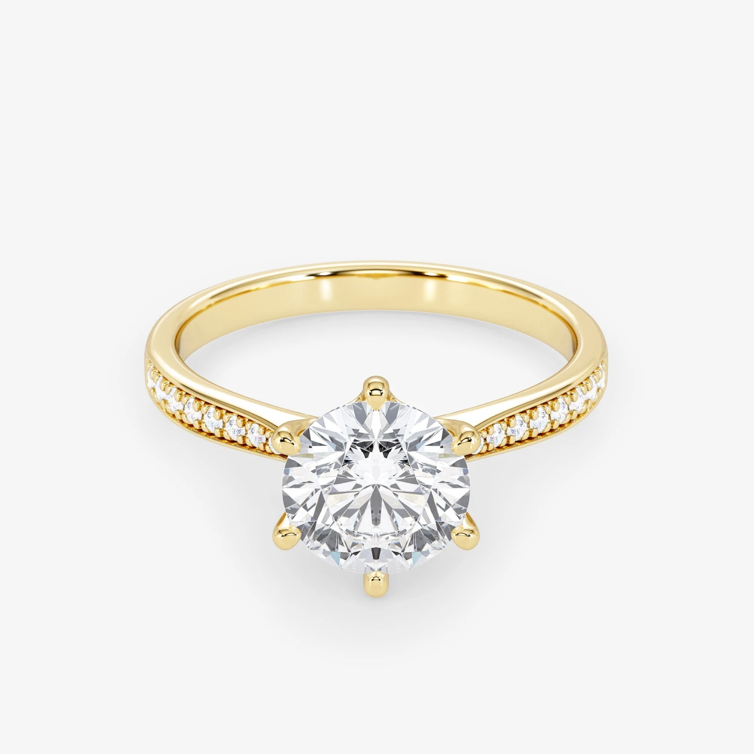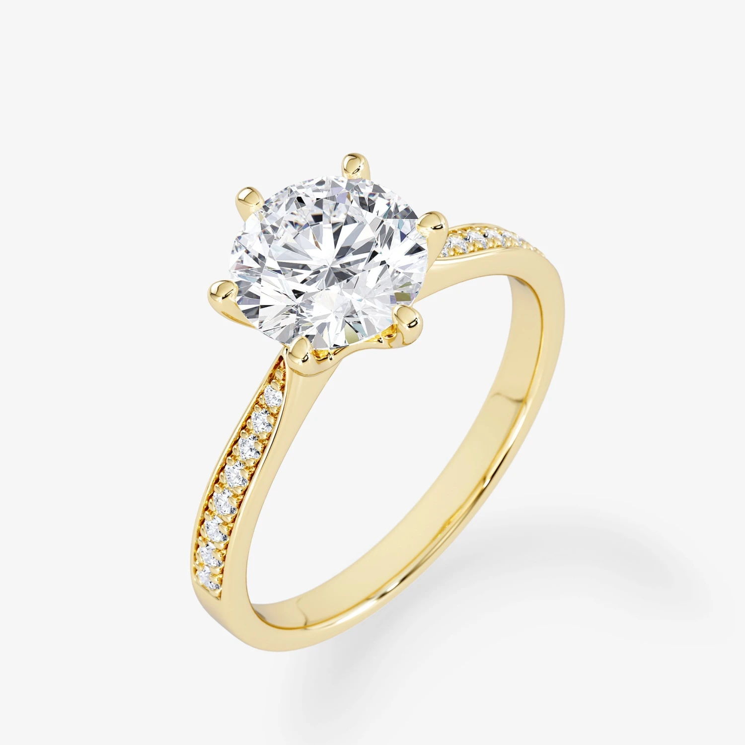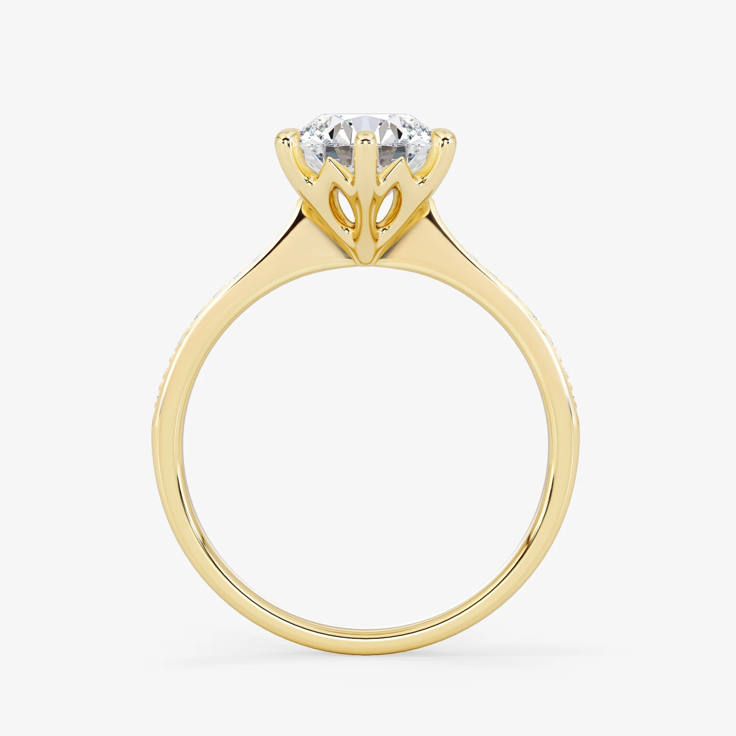 Crafted from the finest 18K gold, this ring exudes a regal charm that is simply irresistible. The brilliant cut diamond at the center of the ring is an absolute showstopper, beautifully complemented by the sparkling side stones that add a touch of glamour and sophistication.