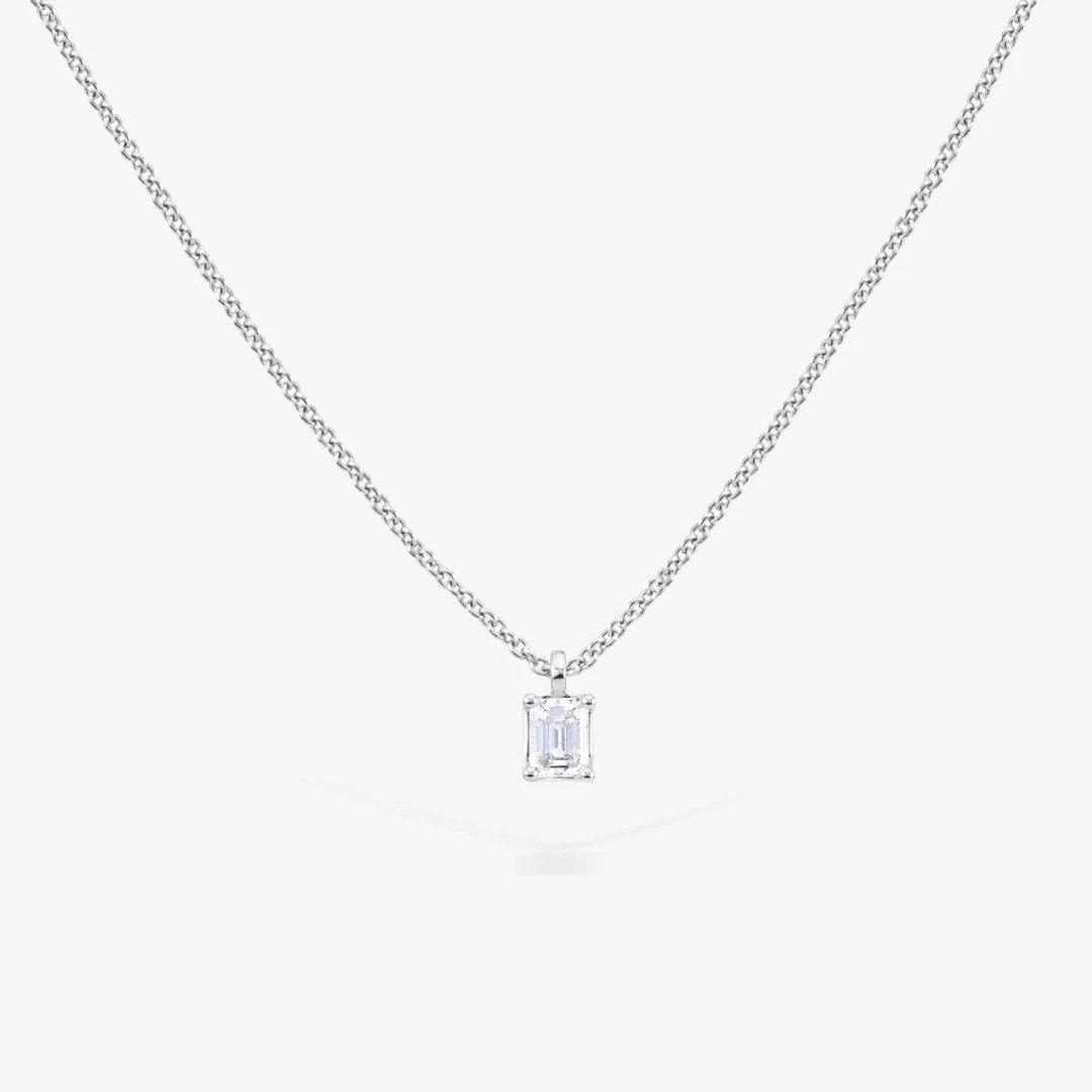 Introducing our alluring “Emerald Cut Necklace,” with a step-cut-faceted, 0.17 carat central diamond, in Top Wesselton color. Emerald cut diamonds have fewer facets compared to brilliant cuts but the Si clarity of this diamond perfectly complements the uniqueness of the “hall-of-mirrors” effect. This necklace is available in 18K white or yellow gold, for a true reflection of elegance.