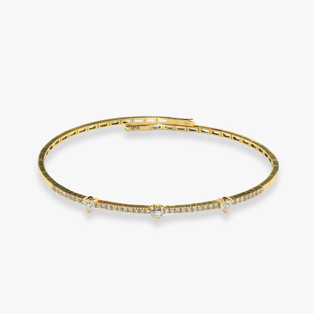 This enchanting piece, crafted from 18K gold, features three small diamond hearts, symbolizing love in its purest form, delicately nestled along the bracelet. Each heart is meticulously crafted with precision and passion, creating a captivating sparkle that mirrors the brilliance of your affection. Surrounding these heart-shaped diamonds are 36 dazzling brilliant stones, with SI clarity, totaling 0.36 carats, strategically placed to enhance the overall allure of the piece.
