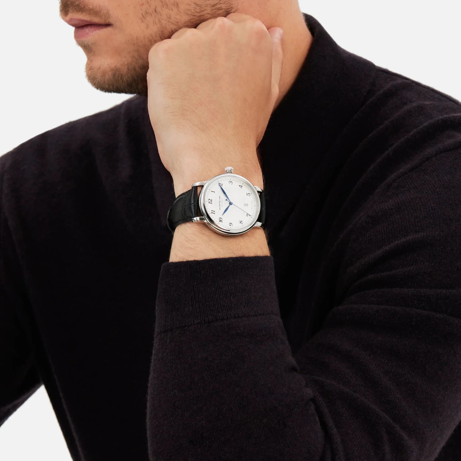 The Montblanc Star Legacy Collection takes its inspiration from Minerva’s heritage and the company’s pocket watches that were made during the late 19th and early 20th centuries. In line with the design codes of the product line, the Montblanc Star Legacy Automatic Date features a refined silver-white dial with the Montblanc exploding star guilloché pattern, Arabic numerals, leaf-shaped hands, a “filet sauté” guilloché motif and a railway track. The timepiece is equipped with the automatic calibre MB 24.17 and features the hours, minutes and seconds in the centre and a date in an aperture at six o’clock. It comes in a 42 mm stainless steel case and is fitted with a black calf leather strap with alligator print.